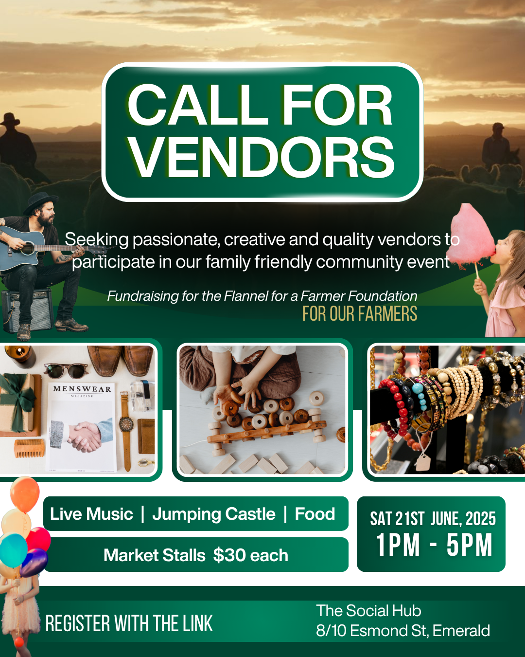 We’re inviting passionate stallholders—makers, growers, creatives, foodies, and community legends—to join us for For Our Farmers, a heartfelt event celebrating the backbone of our region: our farmers.